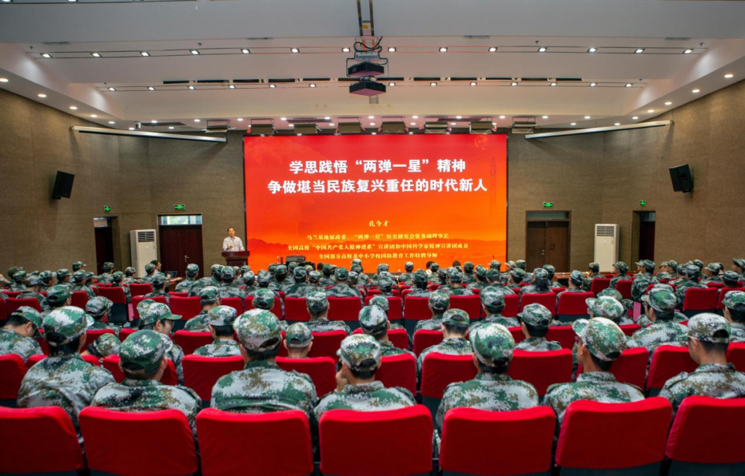 9月18日下午,学校在图书馆报告厅举办全国科普月活动——“两弹一星”精神宣讲会。马兰基地原政委,中国国史学会“两弹一星”历史研究会副理事长,教育部全国高校“中国共产党人精神谱系”宣讲团和中国科协科学家精神宣讲团成员孔令才少将作了题为“学思践悟‘两弹一星’精神,争做堪当民族复兴重任的时代新人”的报告。校党委副书记李江涛主持并讲话。党委宣传部、校团委、科学技术研究院、学生工作处相关领导及老师,军训帮训教官代表和大一新生代表共计230余人参加。