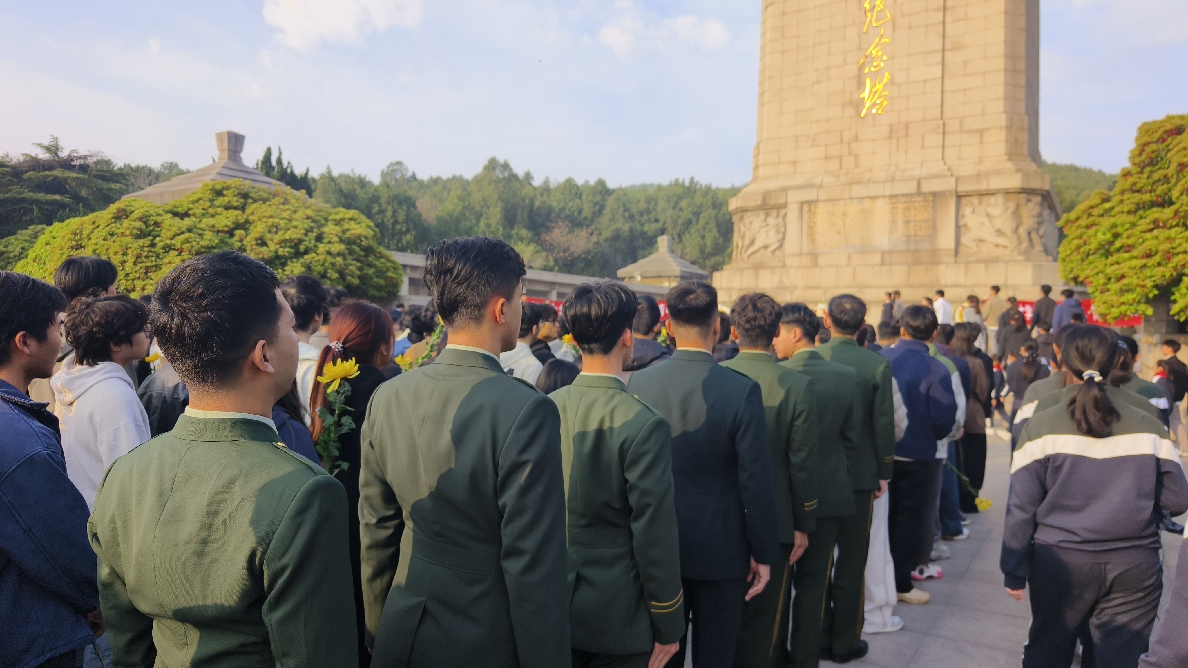 上午8时,退役大学生代表肃立,以标准军人姿态向英烈致敬,带头敬献鲜花、寄托哀思,随后与全体人员一同缓步绕塔瞻仰。