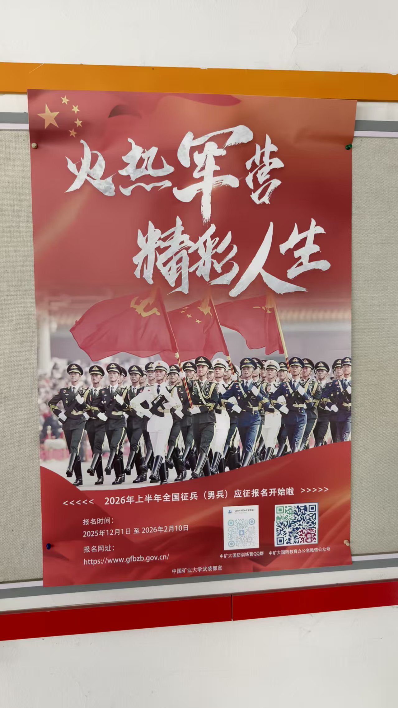 为精准扩大2026年上半年征兵政策宣传覆盖面,12月4日,我校武装部组织开展了征兵宣传海报“进宿舍”专项工作。