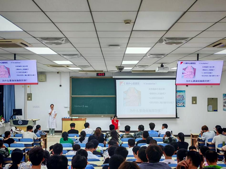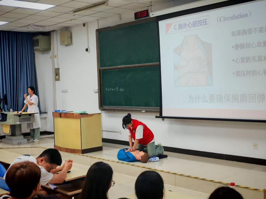 学校特别邀请徐州医科大学组建60余人的专属授课团队,其中包含20余名临床经验丰富的专业医师与40余名经过系统培训的志愿者。授课团队深入各学院教室,采用理论讲解、实操演示与分组练习的复合模式,围绕心肺复苏术(CPR)、创伤止血包扎、骨折临时固定、伤员规范搬运四大核心应急技能展开教学——从心肺复苏的按压深度与频率,到不同伤口的包扎手法,再到骨折固定的器材使用要点,讲师们逐一拆解细节、现场示范,确保每位新生都能清晰理解操作规范。