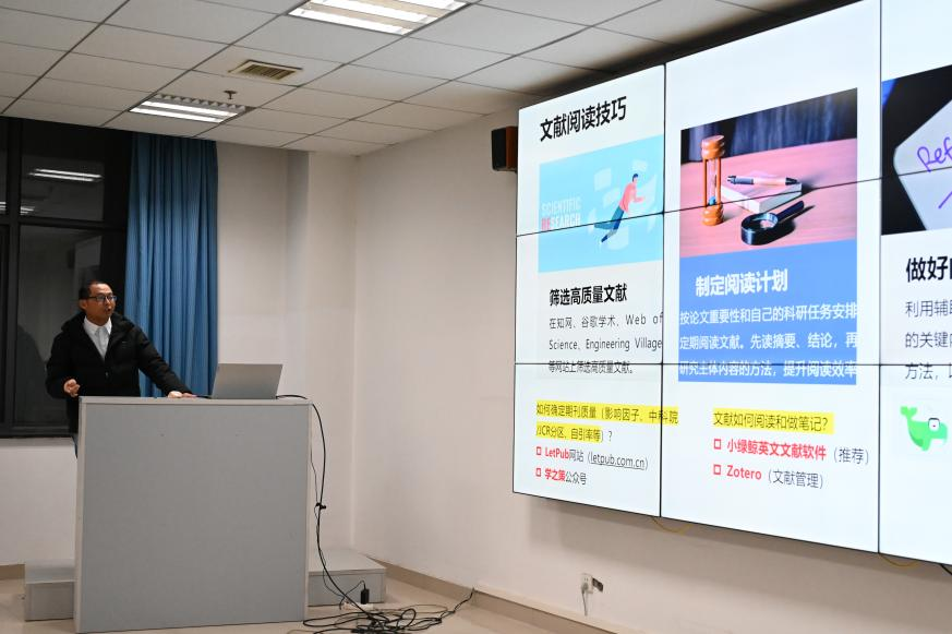 朱敬忠以“科研能力提升与成长规划”为主题,从科研创新、项目参与、论文写作、时间管理与心态调整等方面展开分享。他指出科研创新能力要保持好奇心、养成批判性思维并注重学科交叉;参与科研项目需加强团队沟通、规避拖延,善用文献数据库与图书馆等资源;论文写作发表要兼顾热点、项目与兴趣选题,依托权威数据库调研,严守学术规范并匹配期刊投稿。他建议同学们积极参与学术活动以拓宽视野、积累人脉,提倡制定精细化学习计划、严控娱乐时间,鼓励同学们以积极心态面对挫折,坚持每日积累实现稳步成长。