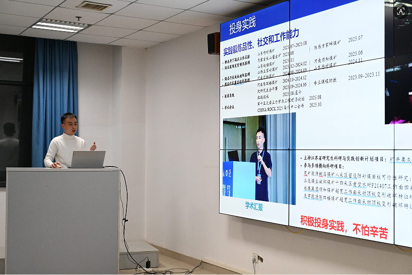 方涵以“科研成长的进阶之路”为主题,从课程基础、实践历练、学术成果到未来规划展开分享。在课程基础板块,他强调要重视专业课程学习,通过课程汇报、论文撰写训练提升表达与写作能力,同时要熟练掌握NoteExpress、FLAC3D、MATLAB等科研软件,为科研工作筑牢基础。他分享了在多个矿场的井下实验与现场监测经历以及校园实践、学术会议参与的收获,鼓励同学们主动投身一线实践,在实践中锤炼品性、提升社交与工作能力。