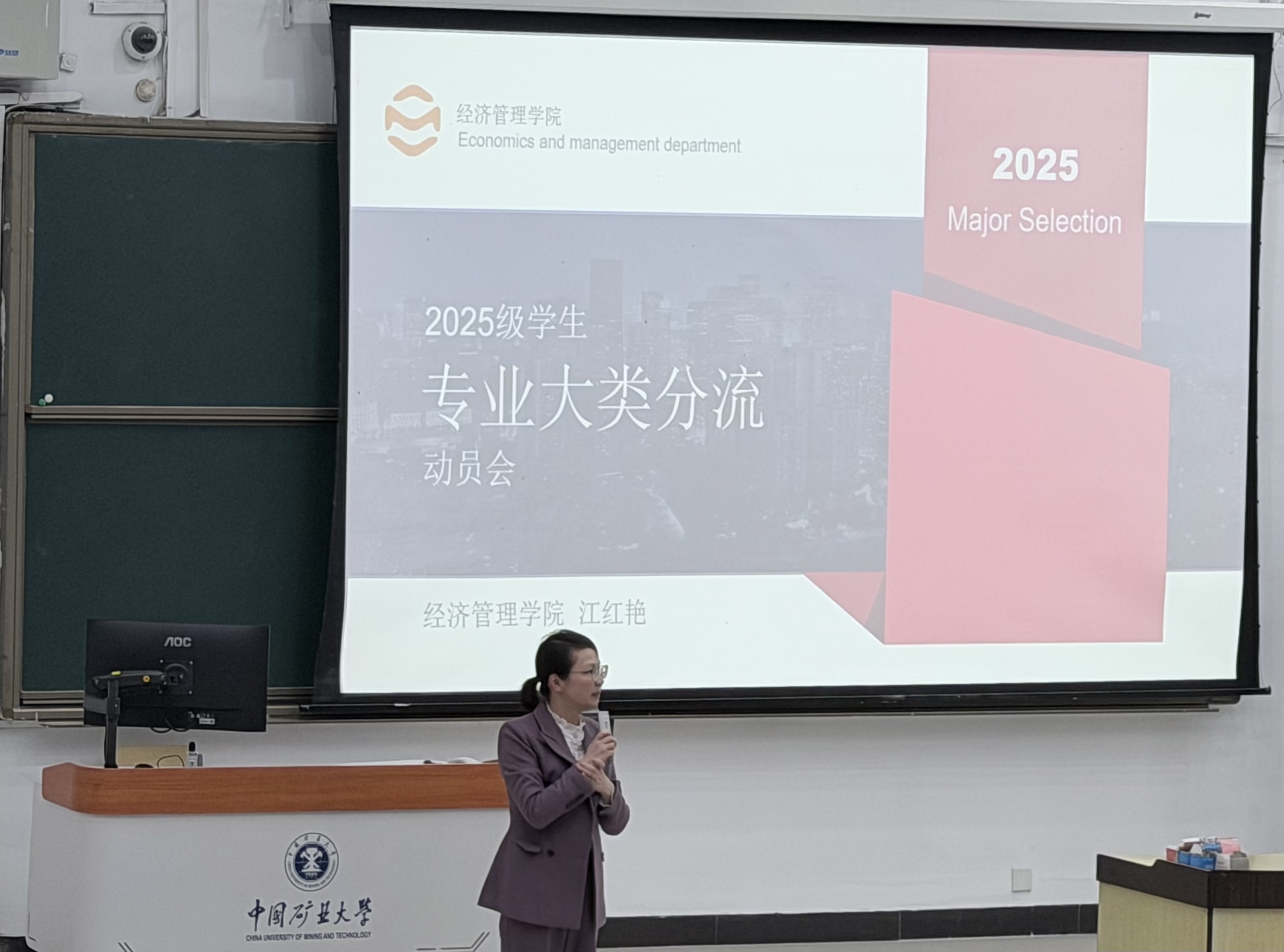 为帮助2025级学生全面了解各专业培养特色、分流政策、理性规划学业方向,经济管理学院于3月23日晚在博二C102教室召开2025级专业介绍会。经济管理学院副院长江红艳、大数据管理科学系主任王华清、电子商务专业建设负责人张磊、会计学系主任刘建勇、金融系主任李凯风、企业管理系主任牟宇鹏、应用经济研究所副所长吉生保,教学管理办公室主任刘冉、教学秘书王辉,专职辅导员赵杰、刘子睿出席并做专业介绍及政策解读。本次会议以“明确专业方向,规划学业征程”为主题,为同学们科学选择专业、合理规划学业与职业发展指明了方向。