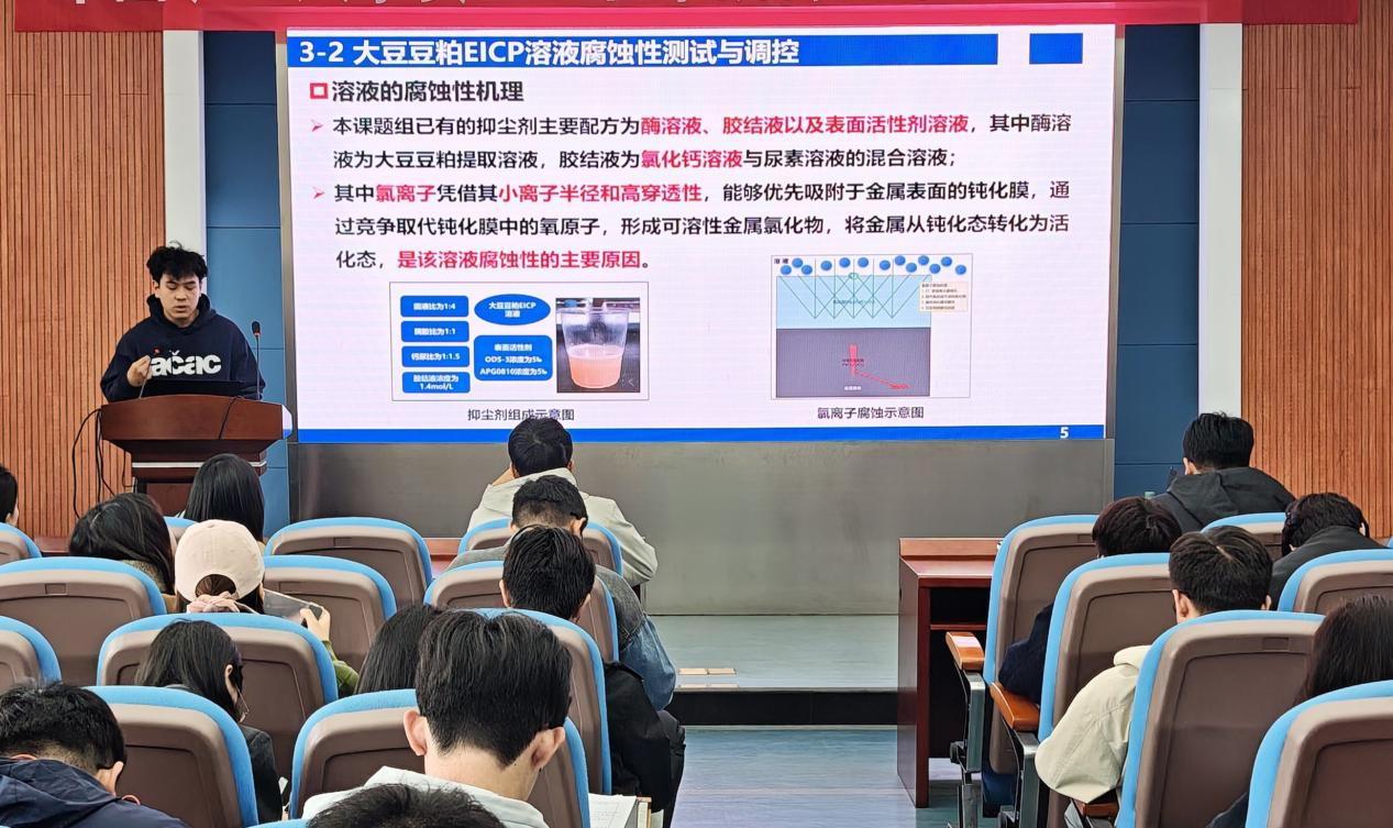 聚焦安全工程前沿研究,三位主讲人依次分享学术成果。张世勇围绕高层建筑无人机灭火救援,介绍了P-Mg复合干水的灭火效能及作用机理;杨腾锐针对水射流破煤与煤与瓦斯流态化共采,阐述了流态化造穴装置的调控机制与参数优化方法;李志仁聚焦煤炭粉尘防治,探究了大豆豆粕基矿用抑尘剂的腐蚀性调控与抑尘性能。报告结束后,嘉宾与同学们围绕科研方法、实验设计及成果转化等话题深入交流,共享科研心得。